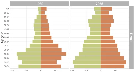 Until very recently, it has been relatively difficult to migrate out from Tuvalu. As a result we see a more or less regular population pyramid for a country in the late stage of demographic transition.