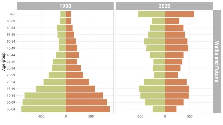 Kiribati today has about four times the population of Marshall Islands but in 1980 was only about double. The significant thing here is the wasp waist of the Marshall Islands pyramid in 2025—while it had a similar shape to Kiribati in 1980. People at peak working and reproductive age are literally absent from today’s Marshall Islands—in this case, primarily in the USA, which gives automatic residence rights to the Compact of Free Association Countries (Marshall Islands, Palau and Federated States of Micronesia).